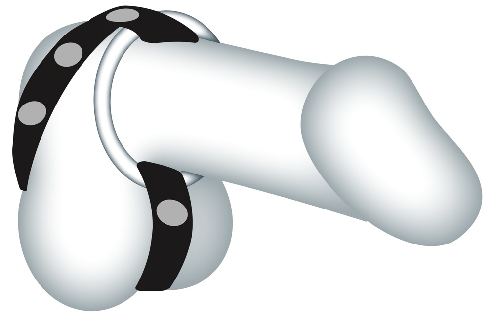 Skórzany pas na penisa z wymiennymi pierścieniami o różnej średnicy( 3 cm, 3.5 cm i 4 cm). Regulowany.